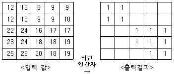 <입력 값>을 이용하여 <출력결과>를 얻기 위한 비교연산자로 옳은 것은?