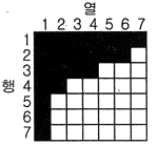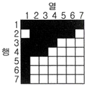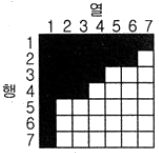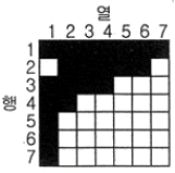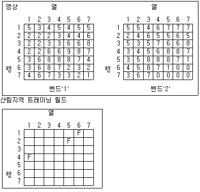 그림과 같은 영상을 분석하기 위해 산림지역의 트레이닝 필드를 선정하였다. 영상에 대응하는 7×7의 지역에 대해 사변형 분류법(parallelepiped classification)을 적용하여 산림지역으로 분류된 결과로 옳은 것은? (단, 검게 칠해진 지역이 산림지역이다.)
