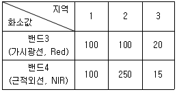 지역 1, 2, 3에 대해서 LANDSAT-7의 3번과 4번 밴드의 화소값을 구한 결과가 표와 같다. 각 지역의 정규화식생지수(NDVI)로 옳은 것은?