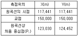 원곡선 설치를 위한 측점위치를 좌표가 표와 같을 경우 원곡선의 시점으로부터 원곡선상 처음 중심선(P1)까지의 편각은?