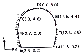 그림과 같이 터널 단면의 좌표(x, y)를 측정하였을 때 이 좌표에 의한 터널의 내공단면적은? (단, 단위 : m)