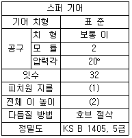 아래 그림음 표준 스퍼기어 요목표 이다. (1), (2)에 들어 갈 숫자로 옳은 것은?
