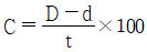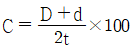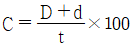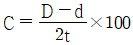 전단금형에서 클리어런스를 구하는 식으로 옳은 것은? (단, D : 다이의 직경(mm), d : 펀치의 직경(mm), t : 가공소재의 두께(mm), C : 클리어런스(%)이다.)