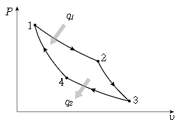 카르노(Carnot) 사이클의 P-v 선도에서 각 사이클 과정에 대한 설명으로 옳은 것은? (단, q1 및 q2는 열량이다)