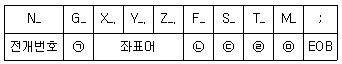 다음과 같은 수치제어 공작기계 프로그래밍의 블록 구성에서, ㉠~㉤에 들어갈 내용을 바르게 연결한 것은? (순서대로 ㉠, ㉡, ㉢, ㉣, ㉤)