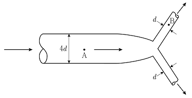 그림과 같은 구조의 원형관 속에서 비압축성 유체의 흐름이 정상상태 층류이고, 직경이 d인 2개의 관 속 유체의 거동은 같다. 직경이 4d인 관의 중심지점 A를 지나는 유체의 질량속도가 2kgs-1m-2일 때, 직경이 d인 관의 중심지점 B를 지나는 유체의 질량속도[kgs-1m-2]는? (단, 마찰손실은 무시한다.)