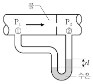 그림과 같이 오리피스와 마노미터가 설치된 수평 원형관 내로 물이 흐른다. 유체의 압력차(P1-P2)가 0.441kgfㆍcm-2일 때 마노미터 읽음(d)[cm]은? (단, 물의 밀도는 1gㆍcm-3, 마노미터 유체인 수은의 밀도는 13.6gㆍcm-3, P1은 지점 ①에서의 압력, P2는 지점 ②에서의 압력, 1kgf=9.8 N이다)