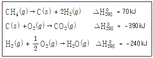 298K에서 각 반응의 표준 반응 엔탈피(△H°298)가 다음과 같을 때, 298K에서 CH4(g) + 2O2(g) → CO2(g) + 2H2O(g) 반응의 표준 반응 엔탈피[kJ]는?