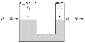 그림과 같이 원형관으로 연결된 수압기에서 왼쪽 관 수면에 수직으로 작용하는 힘(F1)이 40N일 때, 오른쪽 관 수면에 수직으로 작용하는 힘(F2)의 크기[N]는? (단, D1과 D2는 관의 지름이고, 두 수면의 높이는 같다)