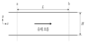 는 유체의 평균속도, μ는 유체의 점도, H는 판 사이의 간격이고, 유체는 정상상태로 x축 방향으로만 흐르며, 중력과 말단 영향(end effect)은 무시한다)