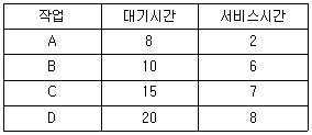 HRN(Highest Response-ratio Next) 방식으로 스케줄링할 경우, 입력된 작업이 다음과 같을 때 우선 순위가 가장 높은 작업은?