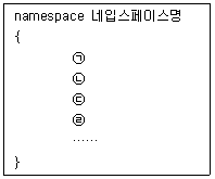 다음은 프로그램에서 이름이 유효한 범위를 한정하는 namespace의 기본형태이다. ㉠~㉣에 들어갈 내용의 순서를 올바르게 나열한 것은?