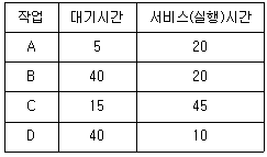 HRN 방식으로 스케줄링 할 경우, 입력된 작업이 다음과 같을 때 우선순위가 가장 높은 것은?