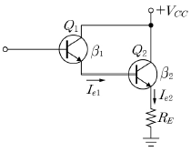트랜지스터 Q2의 이미터 전류 Ie2=β1β2Ie1이다.