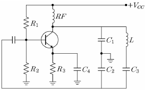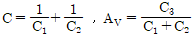 <보기>의 클랩 발진기에서 공진주파수 계산에 사용되는 등가커패시턴스(C)와 회로 발진시동에 필요한 전압이득(AV)의 수식으로 가장 옳은 것은?