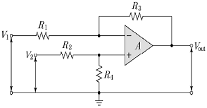 <보기>에서 “A”로 표시된 부분을 이상적인 OP-AMP라고 할 때, 회로의 각 저항들이 R1=R2, R3=R4의 조건을 만족할 경우 입력 전압 V1, V2와 출력 전압 Vout의 관계식으로 가장 옳은 것은?