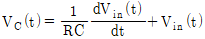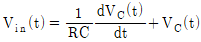 <보기>와 같은 R-C회로에서 입력 전압이 Vin(t)로 주어질 때, 커패시터 C의 양단 전압 VC(t)와 Vin(t) 간의 관계식으로 가장 옳은 것은? (단, 회로에서 저항의 저항 값은 R[Ω], 커패시터의 정전용량은 C[F]이다.)