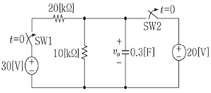 <보기> 회로에서 스위치1(SW1)은 오랫동안 열려있다가 t=0에서 닫히고, 스위치2(SW2)는 오랫동안 닫혀있다가 t=0에서 열린다. t>0일 때 커패시터 양단의 전압 v0(t)[V]를 나타낸 식으로 가장 옳은 것은?