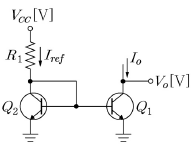 <보기>의 전류거울회로에서 TR Q1, Q2는 동일한 소자이다. 전류증폭율 β0=140이고, 출력저항 r=∞(무한대), VEE=0.7[V], V0>VEE, R1=50[kΩ]로 주어진 경우, I0=0.4[mA]가 되기 위한 VCC의 값[V]은?