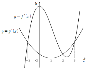 사차함수 f(x)와 삼차함수 g(x)에 대하여 h(x) = f(x) - g(x)라 하자. y = f′(x)와 y = g′(x)의 그래프가 다음 그림과 같을 때, 함수 h(x)가 극대가 되는 x의 값은?