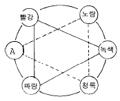 가법혼색과 감법혼색의 3원색 도표 중 "A"에 알맞는 색명은?