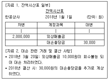 다음은 한공상사의 기초 잔액시산표와 대손충당금 관련 자료이다. 2018년도말 재무상태표상의 외상매출금에 대한 대손충당금은 얼마인가?