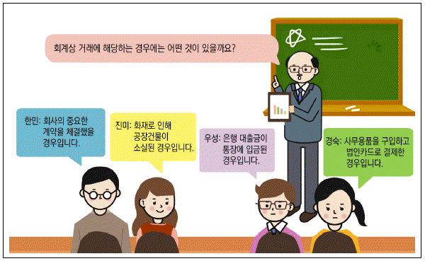 다음 중 회계상 거래에 대해 잘못 답변하고 있는 학생은?
