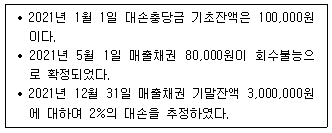 다음은 (주)한공의 대손 관련 자료이다. 12월 31일 결산 후 재무상태표에 기록될 대손충당금은 얼마인가?