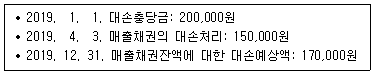 다음은 (주)한공의 2019년 중 매출채권과 관련된 자료이다. 2019년 손익계산서에 표시될 대손상각비는 얼마인가?