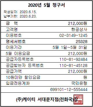 다음은 한공상사의 사무실 전화요금에 대한 청구서이다. 이에 대한 회계처리 시 차변 계정과목으로 옳은 것은?