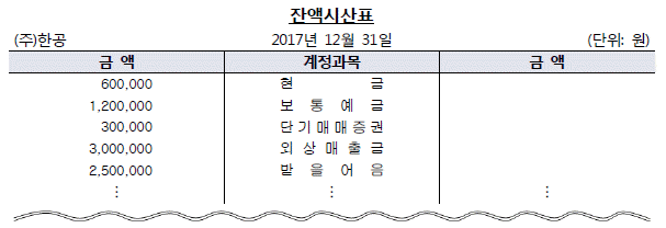 다음 (주)한공의 수정 후 잔액시산표의 일부이다. 매출채권은 얼마인가?