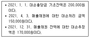 다음은 (주)한공의 2021년 중 매출채권과 관련된 자료이다. 2021년 손익계산서에 계상될 대손상각비는 얼마인가?