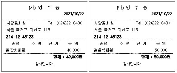 다음은 (주)한공이 화환을 구입하고 수령한 영수증이다. (가)는 (주)한공의 직원자녀 돌잔치를 위한 구입 건이고, (나)는 거래처 직원 결혼식을 위한 구입 건이다. 이에 대한 설명으로 옳은 것은?