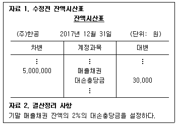 다음은 (주)한공의 2017년 12월 31일 수정전 잔액시산표의 일부와 결산정리 사항이다. 결산정리 사항 반영 후 손익계산서에 표시되는 대손상각비는 얼마인가?