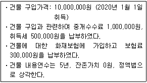 다음은 한공상사의 건물취득 관련 자료이다. 2020년 결산 시 손익계산서에 계상될 감가상각비는 얼마인가?