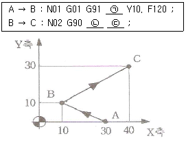 다음 그림의 A→B→C 이동지령 머시닝센터 프로그램에서 (ㄱ), (ㄴ), (ㄷ)에 들어갈 내용으로 옳은 것은?