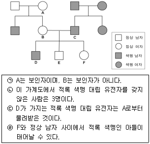 그림은 어떤 집안의 적록 색맹에 대한 가계도이다. 이에 대한 설명으로 옳은 것만을 보기에서 있는 대로 고른 것은? (단, 돌연변이는 고려하지 않는다.)