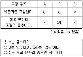 표는 중추 신경계를 구성하는 구조 A∼C에서 2가지 특징의 유무를 나타낸 것이다. A∼C는 각각 연수, 중뇌, 척수 중 하나이다. 이에 대한 설명으로 옳은 것만을 보기에서 있는 대로 고른 것은?
