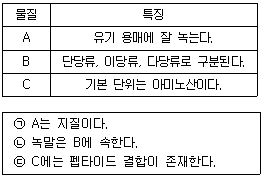 표는 생물을 구성하는 물질 A∼C의 특징을 나타낸 것이다. A∼C는 단백질, 탄수화물, 지질을 순서 없이 나타낸 것이다. 이에 대한 설명으로 옳은 것만을 보기에서 있는 대로 고른 것은?
