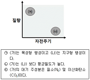 다음 그림은 질량과 자전 주기의 상대적인 차이를 기준으로 태양계 행성을 지구형 행성과 목성형 행성으로 구분하여 나타낸 것이다. 이에 대한 설명으로 옳은 것만을 보기에서 있는 대로 고른 것은?
