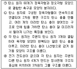 다음은 4가지 종류의 탄소 동소체에 대한 특징을 설명한 것이다. ㉠∼㉣에 해당하는 탄소 동소체로 가장 적절한 것은?(순서대로 ㉠, ㉡, ㉢, ㉣)