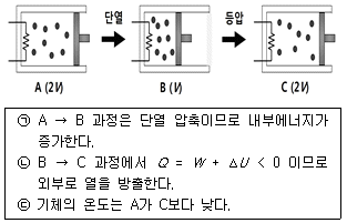 다음 그림은 실린더에 들어 있는 일정량의 이상 기체의 상태를 A → B → C로 변화시키는 과정을 나타낸 것이다. A, B, C의 부피는 각각 2V, V, 2V이고, A → B는 단열 과정, B → C는 등압 과정이다. 이에 대한 설명으로 옳은 것만을 보기에서 있는 대로 고른 것은? (단, Q = 열량, W = 일, U = 내부에너지)