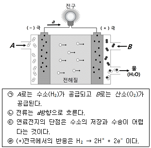다음 그림은 수소연료 전지의 구조와 원리를 모식적으로 나타낸 것이다. 이에 대한 설명으로 옳은 것만을 보기에서 있는 대로 고른 것은?
