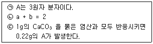 다음은 탄산 칼슘(CaCO3)을 묽은 염산에 넣었을 때 일어나는 반응의 화학 반응식이다. (a, b는 반응계수) 이에 대한 설명으로 옳은 것만을 보기에서 있는 대로 고른 것은? (단, CaCO3의 화학식량은 100이다.)