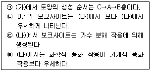 다음 그림 (가)는 성숙한 토양의 단면을, 표의 (나)와 (다)는 열대 및 한대 기후 지역에서 관찰할 수 있는 지형의 특징을 순서 없이 나타낸 것이다. 이에 대한 설명으로 옳은 것만을 보기에서 있는 대로 고른 것은?
