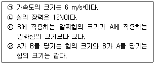 다음 그림과 같이 질량이 각각 2kg, 3kg인 물체 A, B를 실로 연결한 후, 20N의 일정한 힘을 수평면과 나란하게 작용하였더니 두 물체가 등가속도 운동을 하였다. 이에 대한 설명으로 옳은 것만을 보기에서 있는 대로 고른 것은? (단, 실의 질량 및 모든 마찰과 공기 저항은 무시하고, 실은 수평을 유지한다.)
