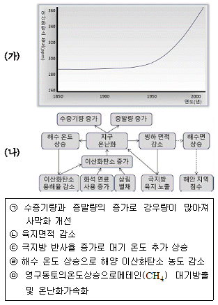 그림 (가)는 대기 중 이산화탄소의 농도 변화를, 그림 (나)는 지구 온난화와 관련된 현상들의 순환경로를 나타낸 것이다. 이산화탄소 농도가 최근 30년 동안의 평균치를 계속 유지 한다고 할 때 일어날 수 있는 현상을 <보기>에서 있는 대로 고른 것은?