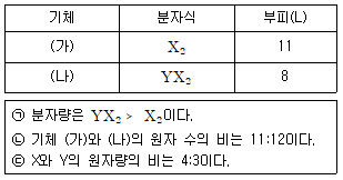 표는 같은 온도와 압력에서 질량이 같은 기체 (가)와 (나)에 대한 자료이다. 이에 대한 설명으로 옳은 것만을 <보기>에서 있는 대로 고른 것은? (단, X와 Y는 임의의 원소 기호이다.)