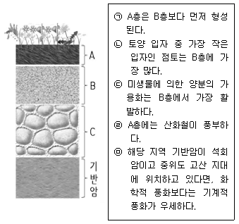 다음 그림은 성숙한 토양의 단면을 나타낸 것이다. 이에 대한 설명으로 옳은 것만을 <보기>에서 있는 대로 고른 것은?