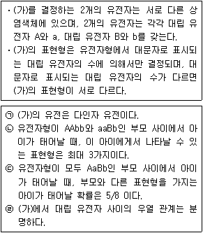다음은 어떤 생물의 유전 형질 (가)에 대한 자료이다. 이에 대한 설명으로 옳은 것만을 <보기>에서 모두 고른 것은? (단, 돌연변이와 환경의 영향은 고려하지 않는다.)